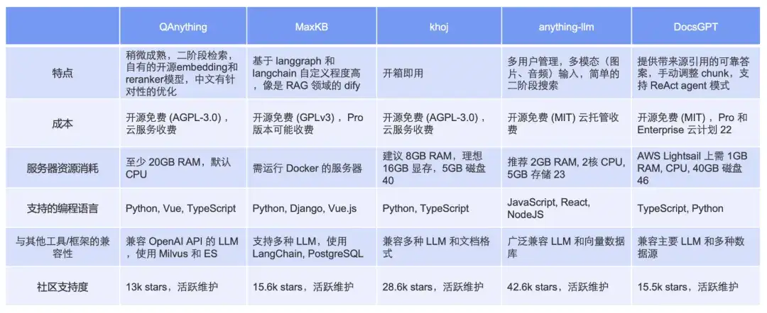 anything-llm在多用户管理和多模态输入方面有特色。DocsGPT强调来源引用和手动调整chunk。MaxKB基于langgraph,自定义程度高。