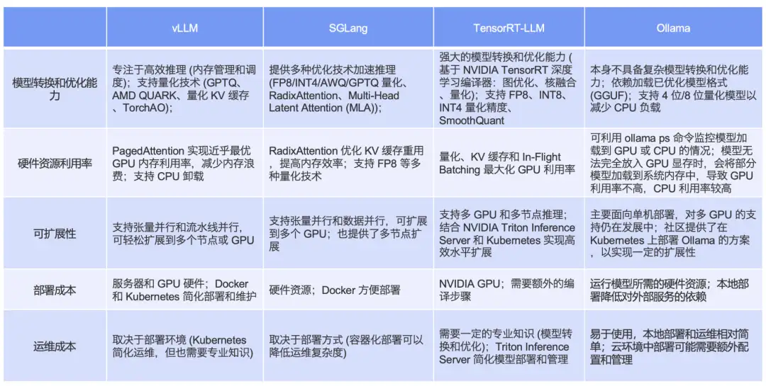 模型训练好后,高效部署是关键。目标是低延迟、高吞吐。所以我们需要模型部署加速工具。从速度上来看:TensorRT-LLM>=SGLang>vLLM>Ollama。
