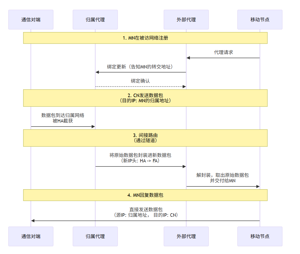 间接路由 通过归属代理的隧道,实现了对通信对方的完全透明,是基础但可能非最优的方案。