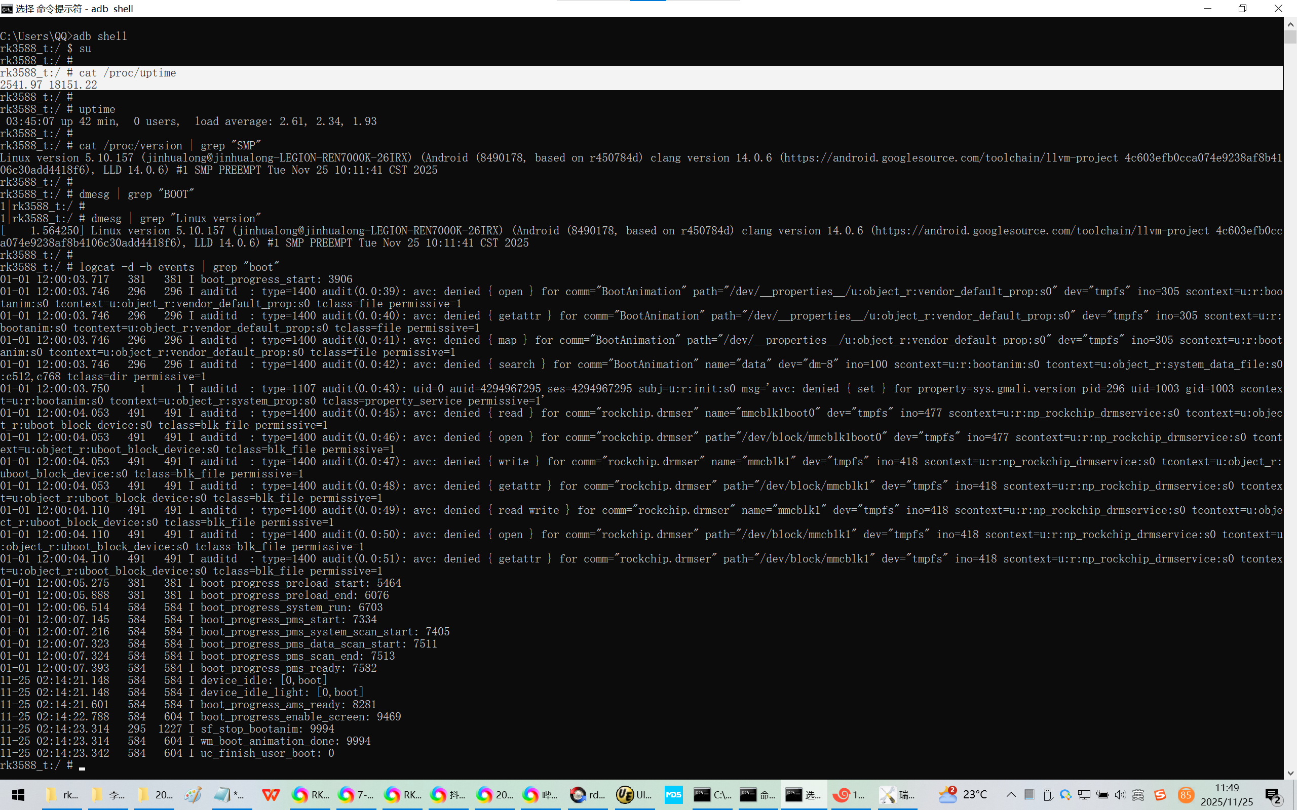 1.564250\] Linux version 5.10.157 (jinhualong@jinhualong-LEGION-REN7000K-26IRX) (Android (8490178, based on r450784d) clang version 14.0.6 (https://android.googlesource.com/toolchain/llvm-project 4c603efb0cca074e9238af8b4106c30add4418f6), LLD 14.0.6) #1 SMP PREEMPT Tue Nov 25 10:11:41 CST 2025 rk3588_t:/ # rk3588_t:/ # logcat -d -b events \| grep "boot" 01-01 12:00:03.717 381 381 I boot_progress_start: 3906 01-01 12:00:03.746 296 296 I auditd : type=1400 audit(0.0:39): avc: denied { open } for comm="BootAnimation" path="/dev/__properties__/u:object_r:vendor_default_prop:s0" dev="tmpfs" ino=305 scontext=u:r:bootanim:s0 tcontext=u:object_r:vendor_default_prop:s0 tclass=file permissive=1 01-01 12:00:03.746 296 296 I auditd : type=1400 audit(0.0:40): avc: denied { getattr } for comm="BootAnimation" path="/dev/__properties__/u:object_r:vendor_default_prop:s0" dev="tmpfs" ino=305 scontext=u:r:bootanim:s0 tcontext=u:object_r:vendor_default_prop:s0 tclass=file permissive=1 01-01 12:00:03.746 296 296 I auditd : type=1400 audit(0.0:41): avc: denied { map } for comm="BootAnimation" path="/dev/__properties__/u:object_r:vendor_default_prop:s0" dev="tmpfs" ino=305 scontext=u:r:bootanim:s0 tcontext=u:object_r:vendor_default_prop:s0 tclass=file permissive=1 01-01 12:00:03.746 296 296 I auditd : type=1400 audit(0.0:42): avc: denied { search } for comm="BootAnimation" name="data" dev="dm-8" ino=100 scontext=u:r:bootanim:s0 tcontext=u:object_r:system_data_file:s0:c512,c768 tclass=dir permissive=1 01-01 12:00:03.750 1 1 I auditd : type=1107 audit(0.0:43): uid=0 auid=4294967295 ses=4294967295 subj=u:r:init:s0 msg='avc: denied { set } for property=sys.gmali.version pid=296 uid=1003 gid=1003 scontext=u:r:bootanim:s0 tcontext=u:object_r:system_prop:s0 tclass=property_service permissive=1' 01-01 12:00:04.053 491 491 I auditd : type=1400 audit(0.0:45): avc: denied { read } for comm="rockchip.drmser" name="mmcblk1boot0" dev="tmpfs" ino=477 scontext=u:r:np_rockchip_drmservice:s0 tcontext=u:object_r:uboot_block_device:s0 tclass=blk_file permissive=1 01-01 12:00:04.053 491 491 I auditd : type=1400 audit(0.0:46): avc: denied { open } for comm="rockchip.drmser" path="/dev/block/mmcblk1boot0" dev="tmpfs" ino=477 scontext=u:r:np_rockchip_drmservice:s0 tcontext=u:object_r:uboot_block_device:s0 tclass=blk_file permissive=1 01-01 12:00:04.053 491 491 I auditd : type=1400 audit(0.0:47): avc: denied { write } for comm="rockchip.drmser" name="mmcblk1" dev="tmpfs" ino=418 scontext=u:r:np_rockchip_drmservice:s0 tcontext=u:object_r:uboot_block_device:s0 tclass=blk_file permissive=1 01-01 12:00:04.053 491 491 I auditd : type=1400 audit(0.0:48): avc: denied { getattr } for comm="rockchip.drmser" path="/dev/block/mmcblk1" dev="tmpfs" ino=418 scontext=u:r:np_rockchip_drmservice:s0 tcontext=u:object_r:uboot_block_device:s0 tclass=blk_file permissive=1 01-01 12:00:04.110 491 491 I auditd : type=1400 audit(0.0:49): avc: denied { read write } for comm="rockchip.drmser" name="mmcblk1" dev="tmpfs" ino=418 scontext=u:r:np_rockchip_drmservice:s0 tcontext=u:object_r:uboot_block_device:s0 tclass=blk_file permissive=1 01-01 12:00:04.110 491 491 I auditd : type=1400 audit(0.0:50): avc: denied { open } for comm="rockchip.drmser" path="/dev/block/mmcblk1" dev="tmpfs" ino=418 scontext=u:r:np_rockchip_drmservice:s0 tcontext=u:object_r:uboot_block_device:s0 tclass=blk_file permissive=1 01-01 12:00:04.110 491 491 I auditd : type=1400 audit(0.0:51): avc: denied { getattr } for comm="rockchip.drmser" path="/dev/block/mmcblk1" dev="tmpfs" ino=418 scontext=u:r:np_rockchip_drmservice:s0 tcontext=u:object_r:uboot_block_device:s0 tclass=blk_file permissive=1 01-01 12:00:05.275 381 381 I boot_progress_preload_start: 5464 01-01 12:00:05.888 381 381 I boot_progress_preload_end: 6076 01-01 12:00:06.514 584 584 I boot_progress_system_run: 6703 01-01 12:00:07.145 584 584 I boot_progress_pms_start: 7334 01-01 12:00:07.216 584 584 I boot_progress_pms_system_scan_start: 7405 01-01 12:00:07.323 584 584 I boot_progress_pms_data_scan_start: 7511 01-01 12:00:07.324 584 584 I boot_progress_pms_scan_end: 7513 01-01 12:00:07.393 584 584 I boot_progress_pms_ready: 7582 11-25 02:14:21.148 584 584 I device_idle: \[0,boot