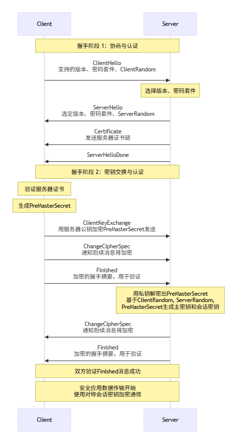 这是 TLS 最精妙的部分。我们以最常见的 RSA 握手流程 为例,分解其步骤: