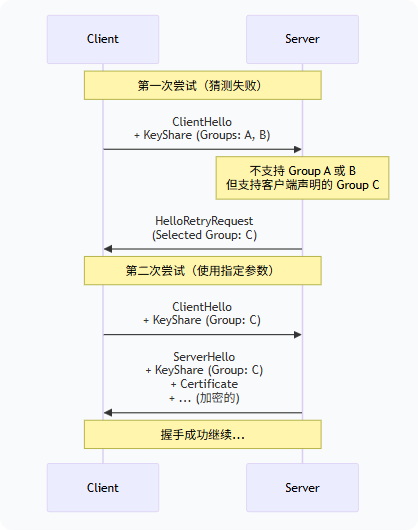 HelloRetryRequest后,会重新构造一个ClientHello消息,这次它会乖乖地包含服务器指定的Group C的密钥共享参数。 -