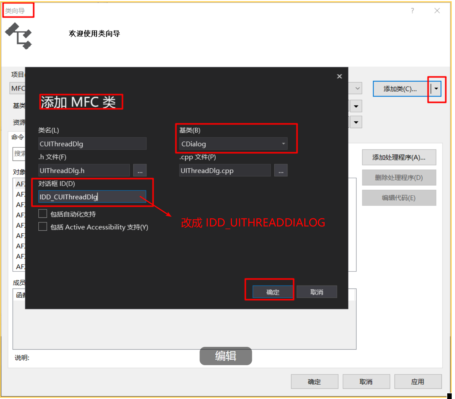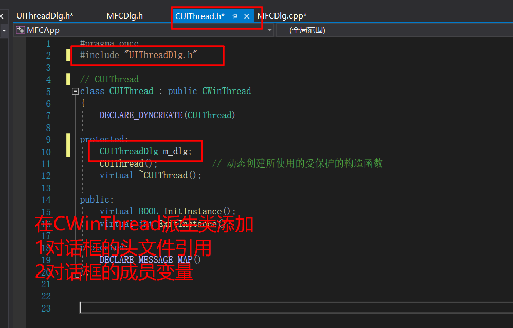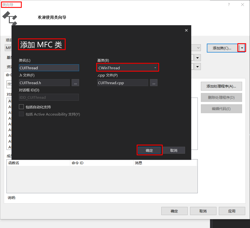 创建用户界面线程时必须做的第一件事是从 CWinThread 派生类。 必须使用 DECLARE_DYNCREATE 和 IMPLEMENT_DYNCREATE 宏声明和实现此类。 此类必须重写某些函数,也可以重写其他函数。
