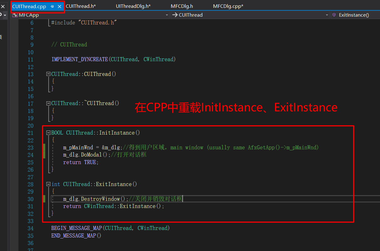 | InitInstance | 执行线程实例初始化。 必须被重写。 |