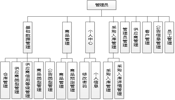 管理员可查看商品库存统计报表,还能对商品、商品预定信息、供应商信息、商品采购入库信息、客户信息、公告信息、员工信息等进行管理;员工的详细功能则依据图4.2的员工功能结构图,能够查询商品,添加商品预定信息、商品采购入库信息、客户信息,也可查看公告。