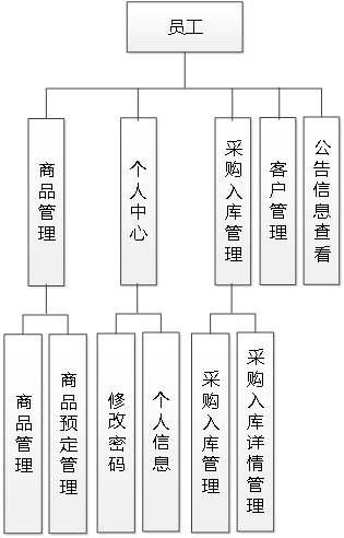 员工功能结构图。其中员工查询商品,添加商品预定信息,添加商品采购入库信息,添加客户信息,查看公告等