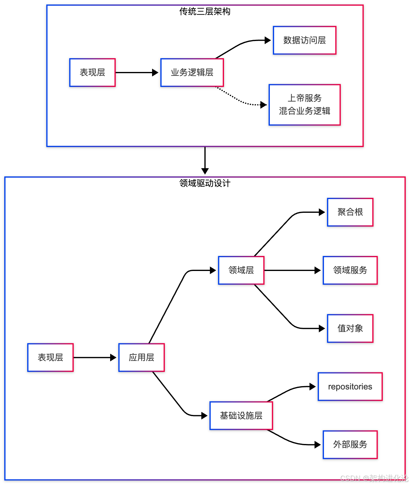 为了更直观地理解架构演进,以下图表展示了从传统三层架构到现代领域驱动设计的变化: