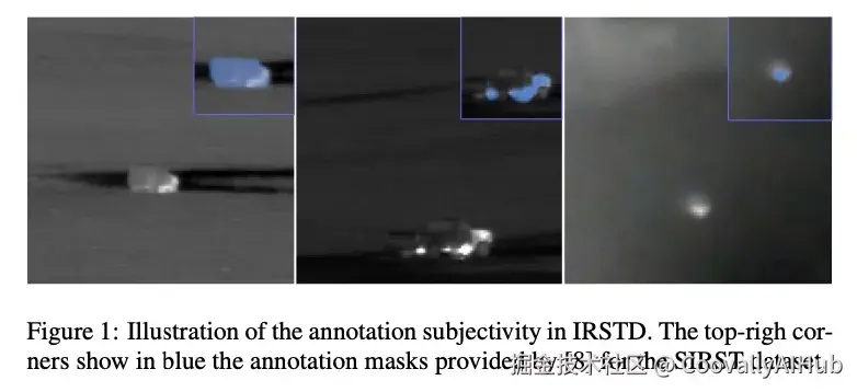 红外小目标检测(IRSTD)是国防领域中一项极具挑战性但又至关重要的任务,其特点是目标尺寸微小、背景复杂以及学习条件困难。基于深度学习的 IRSTD 方法已被提出来应对这些挑战,并取得了最先进的(SOTA)性能。这些方法利用密集嵌套架构或注意力机制 等技术来减少小目标上的信息丢失并降低与背景元素的混淆。然而,当前的 SOTA IRSTD 方法由于依赖于分割网络而面临局限性。一个主要问题是它们的评估深受主观标注的影响。