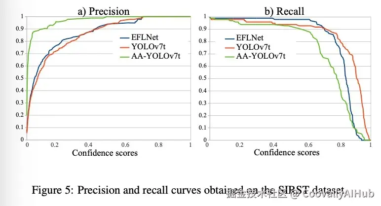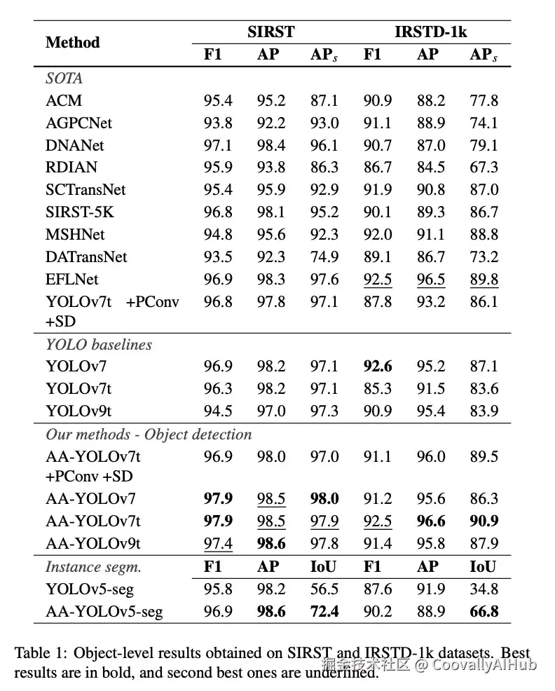 例如,我们最小的骨干网络 YOLOv9t 在集成我们的 AADH 后,在 SIRST 数据集上的 F1 提高了 2.9%,在 IRSTD-1k 数据集上的 APs 提高了 4.0%。与 SOTA 方法相比,我们的方法 i) 优于基于分割的方法,ii) 对 [7] 提出的方法有益,并且 iii) 与 EFLNet 具有竞争力。值得注意的是,我们性能最佳的配置 AA-YOLOv7t,在 IRSTD-1k 上的 APs 比 EFLNet 提高了 1.1%,同时训练参数少了六倍并且设计节俭。