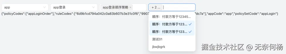 首先需要一个级联选择器,依次是应用-策略集-策略-规则,当然如果后期增加了租户或部门的概念可以再加。