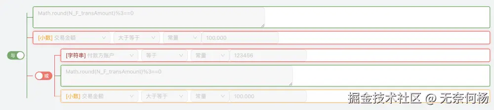 展示也是嵌套的,如果叶子节点满足则是绿色,如果不满足则是红色,如果因为条件短路表示跳过是橘色,条件组会依据组合的"与或"关系展示对应的按钮颜色。