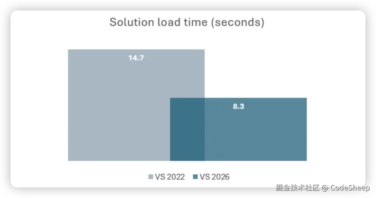 具体而言,大型解决方案或项目的加载时间从 Visual Studio 2022 的 14.7 秒缩短到了 8.3 秒。