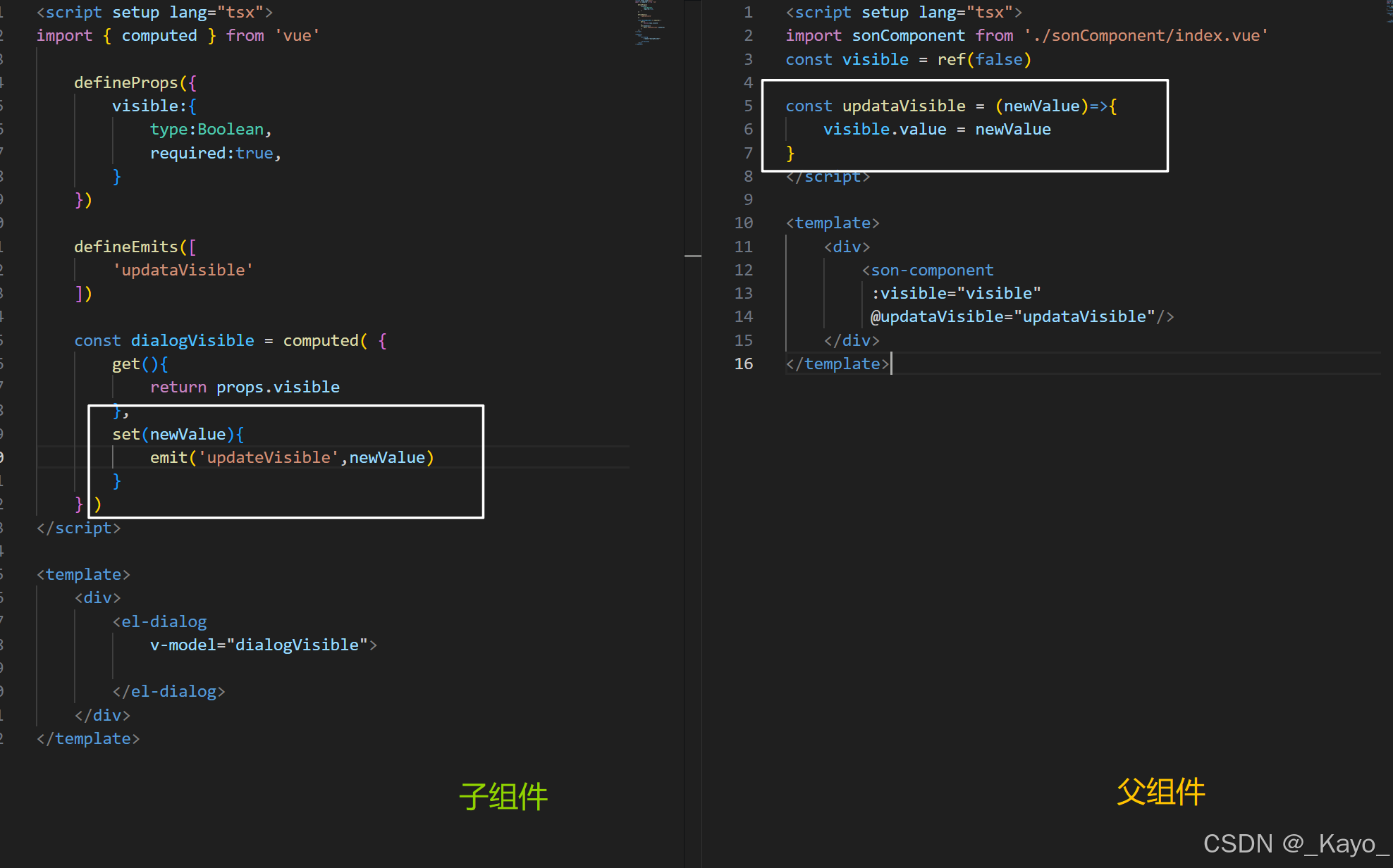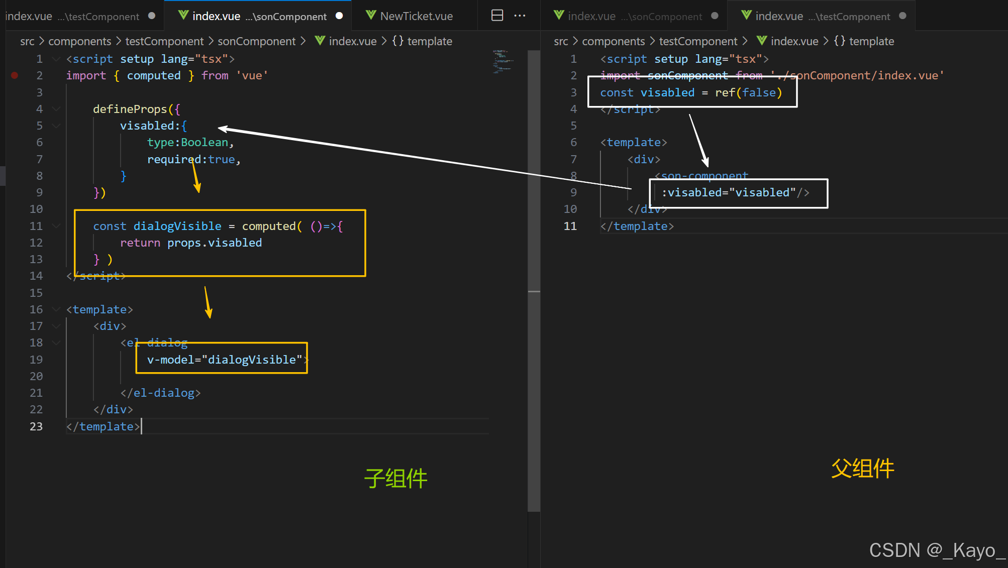 会记这篇博客,其实主要是因为在实际项目拆分组件的时候,拆分的是一个dialog,而digloag绑定的v-model来源于父组件,props不能直接作为v-model,且由于传递的v-model是控制dialog是否显示的visiable,如果dialog关闭,visiable的值需要回传给父组件,因此需要用到computed的set和get实现。