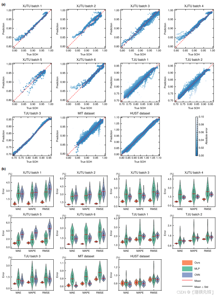 此外,为了反映模型的稳定性,每个模型在每个数据集上的训练和测试过程重复10次。测试结果如图4B所示。从图中可以看出,我们建议的Pinn在所有任务和所有指标上都是最稳定的。XJTU电池数据集每一批的样本量都很小,导致MLP和CNN的波动很大。相比之下,我们的方法更稳定,产生的测试误差更小。对于HUST数据集和MIT数据集,它们包含大量的训练样本,因此MLP和CNN的波动变小,测试误差变小。然而,我们提出的Pinn仍然是表现最好的模型。