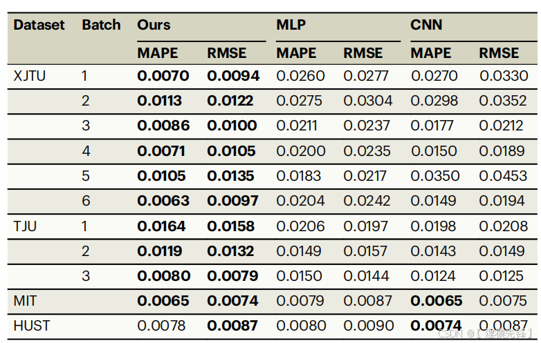 为了展示所提出的Pinn、具有相同结构和参数的多层感知器(MLP)和具有相似结构和参数的卷积神经网络(CNN)的先进性参数数量被用作比较方法。MLP和CNN的详细信息见补充说明3。对于每个数据集,我们将训练电池、验证电池和测试电池按大约6:2:2的比例进行划分。每个数据集中的测试电池数量见表S。为确保公平,测试电池的数量均匀分布在整个数据集中,如表S3-S6所示。表2显示了3个模型在4个数据集上的测试结果(只给出了每个数据集的平均测试误差,每个电池的测试结果可以在表S3-S6中查看)。从表中可以看出,我们的方法在大多数情况下具有最小的估计误差。PINN在4个数据集上的平均MAPE分别为0.85%、1.21%、0.65%和0.78%,而MLP的平均MAPE分别为2.60%、1.72%、0.83%和0.83%。值得注意的是,它们在推理过程中具有相同的参数数量和模型结构。