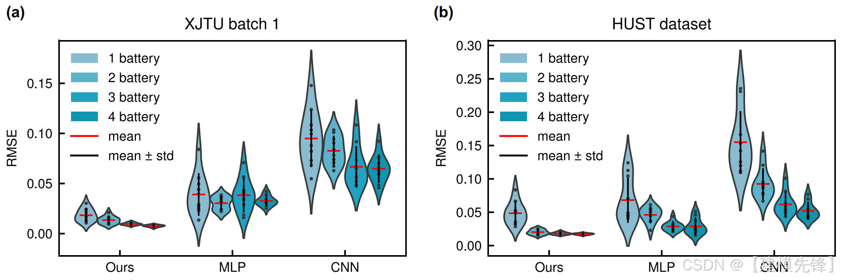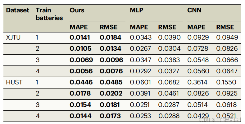 具体来说,我们使用1个电池数据训练3个模型,并对多个电池进行测试(测试集与2.4中相同),并记录测试结果。此外,我们逐步增加训练电池的数量,并观察每个模型在测试集上的性能变化。表3和图5给出了结果(XJTU数据集只给出了批次1的结果,更多的结果可以在表S7和图7中找到)。S5)。