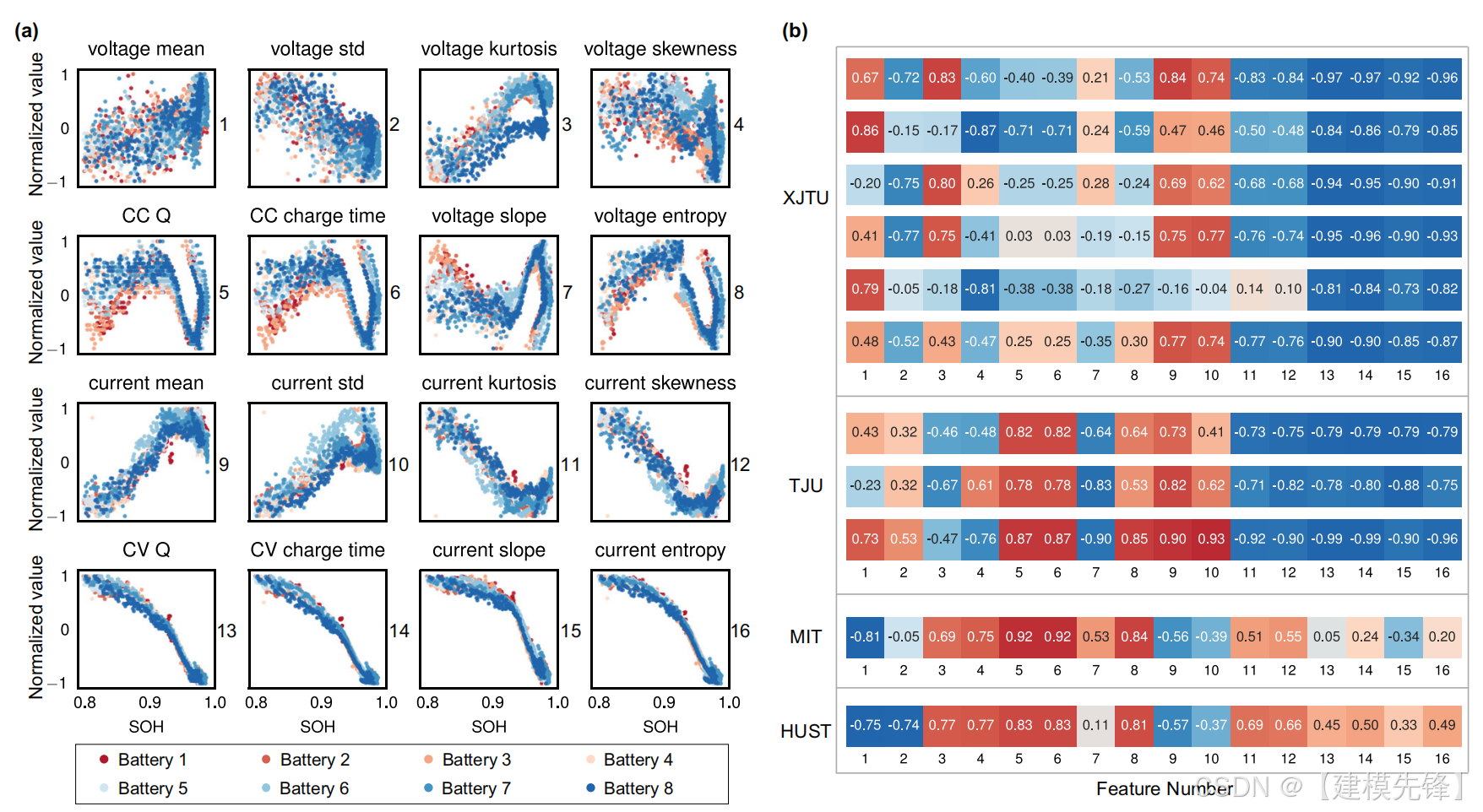 所选电流和电压曲线的平均值、标准差、峰度、偏度、充电时间、累积电荷、曲线斜率和曲线熵(这些特征用数字表示分别为1-16。详情见补充说明2)。图1中给出了从XJTU数据集Batch1中提取的特征的图示3A。此外,我们从4个数据集的387个电池中分别提取了特征,并计算了每个数据集中特征与SOH之间的Pearson相关系数,如图3B所示。