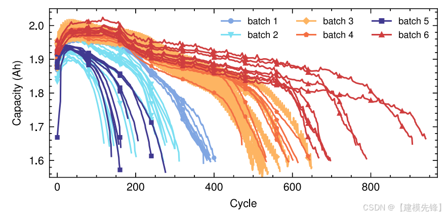 我们在这项研究中开发了一个电池退化实验,如图S1所示。在室温下,在6种充电/放电协议下,共有55个利申制造的电池(LiNi0.5Co0.2Mn0.3O2,标称容量2000 mAh,标称电压3.6 V,充电和放电的截止电压分别为4.2 V和2.5 V)循环至故障。这些协议包括固定充电和放电、不同周期固定电流的随机放电、随机行走以及地球同步轨道(GEO)卫星的充电和放电策略。我们使用批次1到批次6分别表示6种充电/放电方案。退化轨迹如图2所示。有关我们的数据集的更多细节可在补充说明1中找到。
