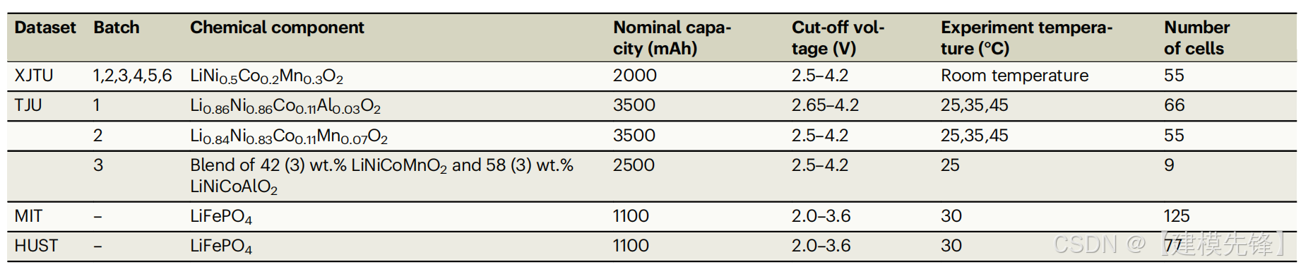 为了涵盖不同的电池类型和化学成分,我们使用了来自4个不同大规模数据集的310,705个电池样本进行验证。第一个数据集来自我们为本研究进行的电池退化实验,其他三个数据集是来自朱等人4、Yeet等人和Severson等人的众所周知的公开数据集。为方便起见,我们将这四个数据集称为XJTU电池数据集、TJU数据集、HUST数据集和MIT数据集。表1给出了这四个数据集的基本信息。