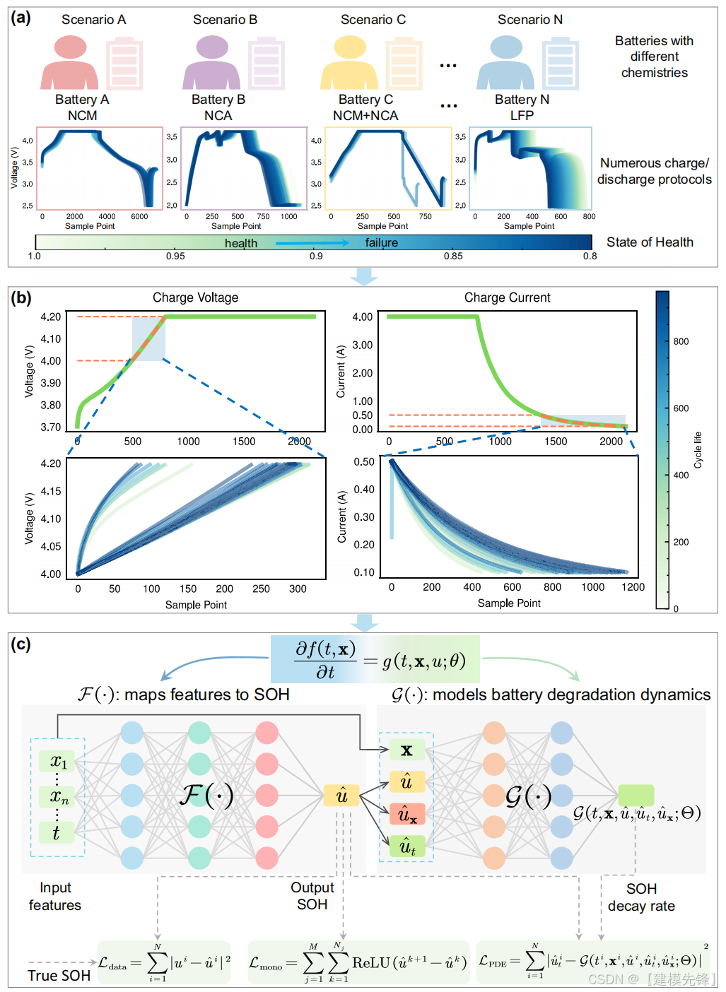 我们开发了一种用于锂离子电池SOH估计的Pinn方法,其流程图如图1所示。我们的方法考虑了电池退化的动态行为以及退化趋势,旨在更全面、可靠、稳定和高精度地估计SOH。