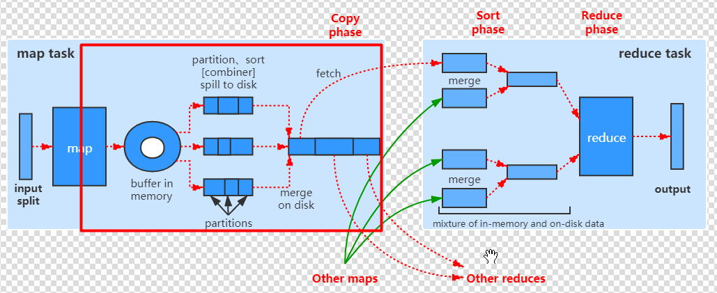 //copy:从完成MapTask的Map端的节点中拷贝处理过的数据