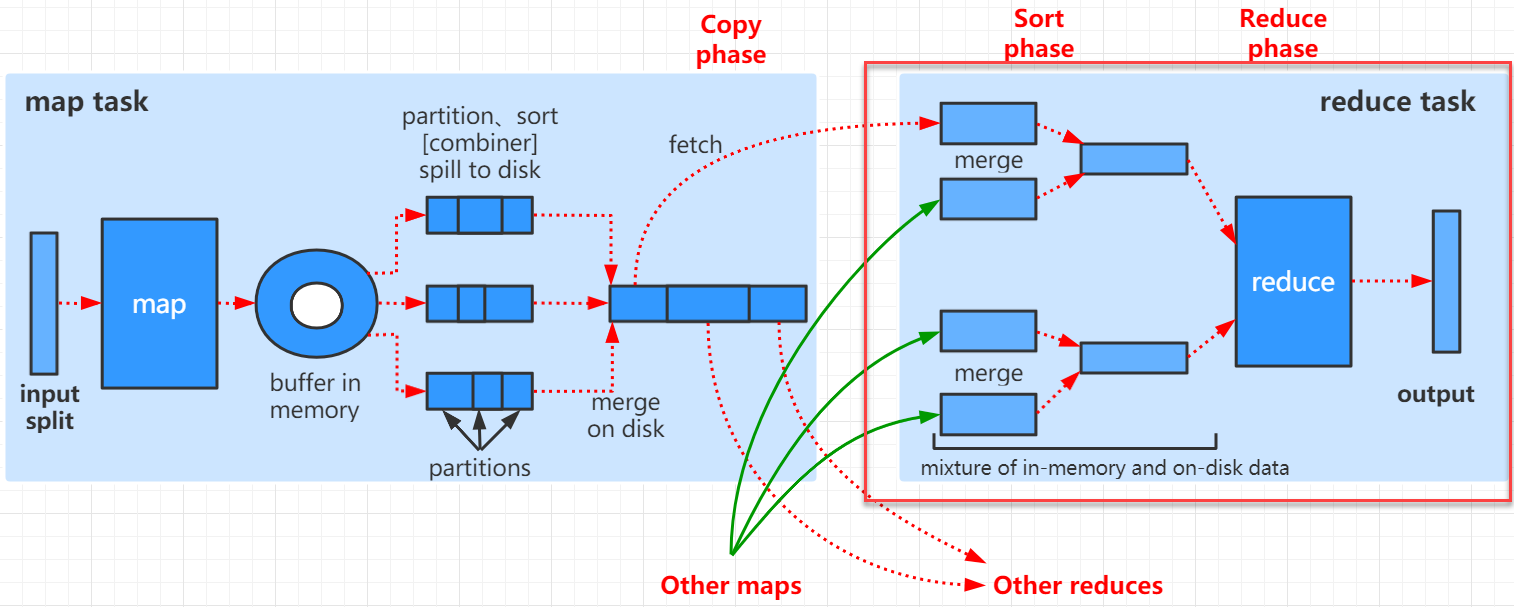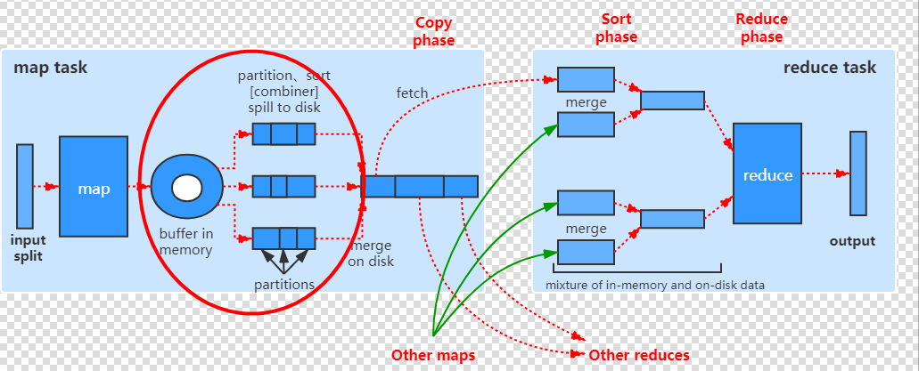 数据经过mapper 任务的处理后,会产生溢出文件,这些文件会被保存到磁盘上。mapper任务完成后,reducer会通过http get的方式从mapper端拷贝对应分区的数据,中间需要经过网络传输。需要做持久化(存盘)或网络传输,这中间就需要做数据的序列化和反序列操作