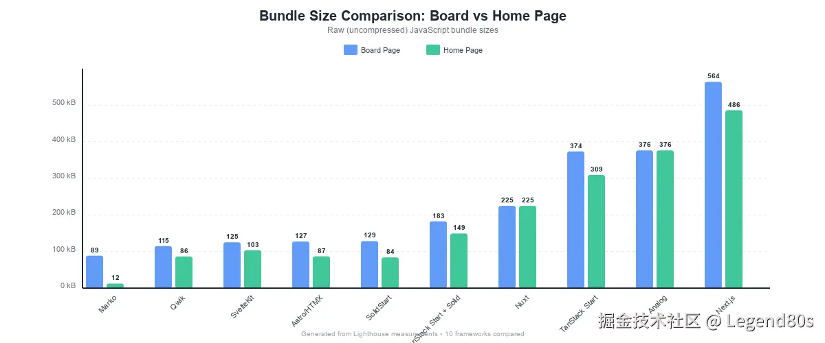 我从一个看似合理的比较开始:Next.js(我们目前需要框架时的默认选择)与SolidStart和SvelteKit(我听说不错的替代方案)。我以为比较三个框架应该很简单。但当我构建了第一个实现并测量包体积时,我注意到了显著差异。Next.js的压缩包体积为154到176 kB,而SolidStart和SvelteKit的压缩包体积为30到54 kB。我想知道这些差异是特定于单个框架的实现,还是框架家族间的系统性差异?如果React、Angular和Vue都采用相似的架构方法,它们的包体积是否会遵循相似的模式?我决定扩展评估范围来找出答案。
