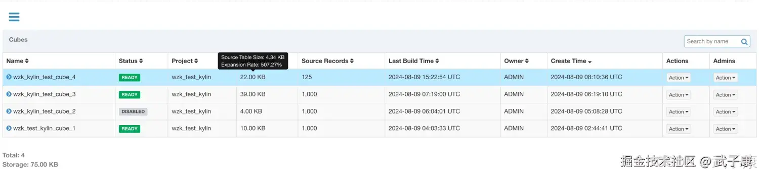 在WebGUI的Model页面选择一个READ状态为Cube,光标移动到该Cube的CubeSize列时,WebGUI会提示Cube的源数据大小,以及当前Cube的大小除以数据源大小的比例,称为膨胀率(Expansion Rate)。