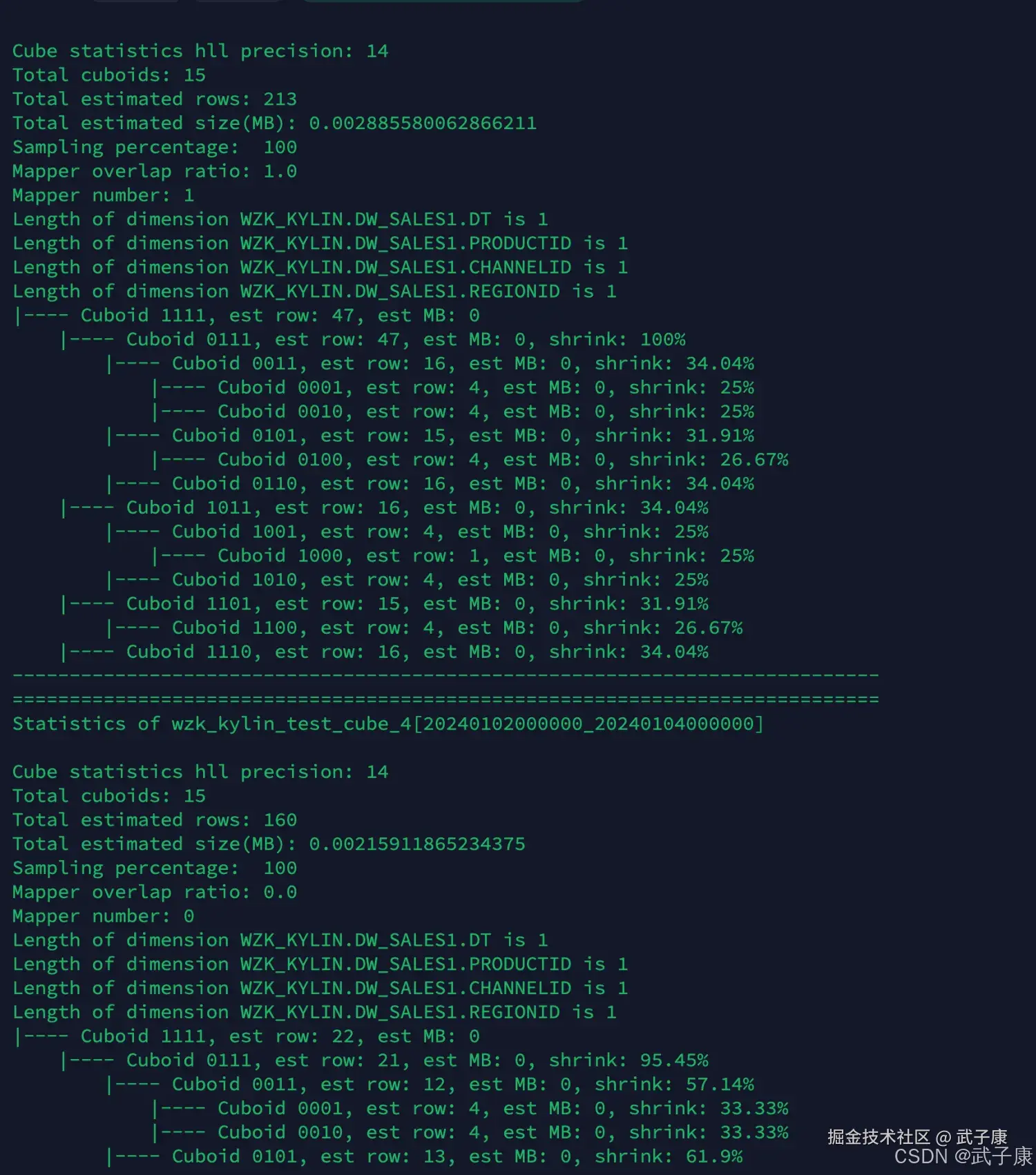 - 最顶端的Cuboid成为Base Cuboid,它直接由源数据计算而来,Base Cuboid的具体信息,包括该Cuboid的输出中除了0和1的数字串以外,后面还有每个Cuboid的具体信息,包括该Cuboid行数的估计值、该Cuboid大小的估计值,以及这个Cuboid的行数与父亲节点的对比(Shrink值)