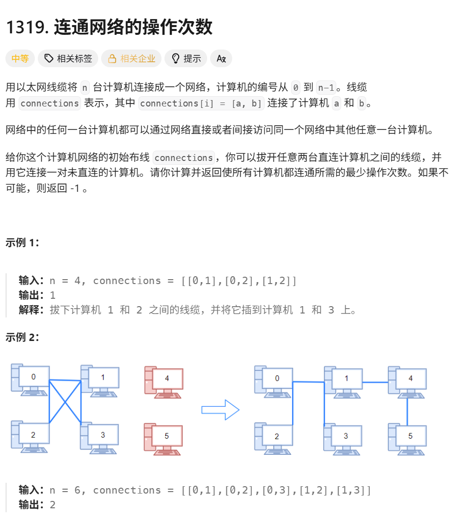结论: 只要总线缆数达标,我们只需要计算出当前的连通分量个数 count ,答案就是 count - 1。我们不需要关心具体拔哪根线,因为题目只问"次数"。