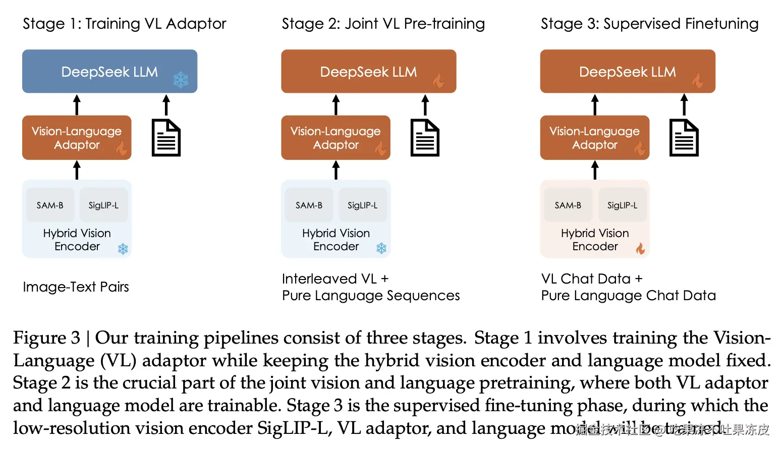 此阶段的重点是开发跨多种任务的综合视觉-语言知识。这个阶段对所有参数进行优化,包括视觉编码器,视觉-语言适配器和 DeepSeekMoE。使用大约800B个图像文本token,该阶段显著增强了模型的多模态理解能力,同时保持了其大部分语言能力。