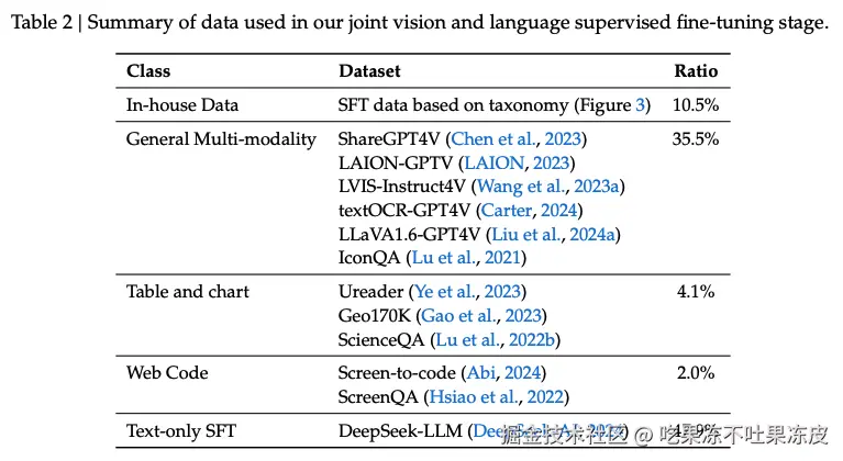 通过有监督微调增强模型的指令遵循和对话能力。利用内部的视觉-语言 SFT 数据,优化所有参数,同时仅监督答案和特殊token,屏蔽系统和用户的提示。为了增强对话理解,将多模态数据与来自 DeepSeek-V2 的纯文本对话数据结合。这种方法确保了模型在多种视觉-语言任务中的强大表现。