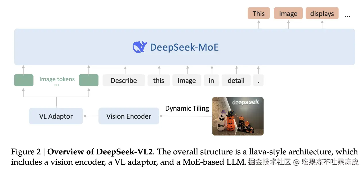 DeepSeek-VL2由三个核心模块组成:视觉编码器、视觉语言适配器和混合专家语言模型。基于其前身DeepSeek-VL的解码器架构,DeepSeek-VL2引入了两大创新:动态分块策略 和DeepSeek MoE语言模型。