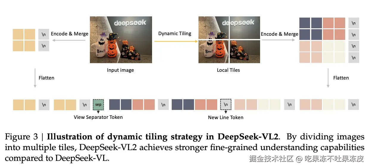DeepSeek-VL2在DeepSeek-VL的基础上,重点攻克了高分辨率图像处理和复杂视觉任务两大难题。通过将高分辨率图像分割成多个图块(tile)分别处理,再整合信息,实现了对图像细节的更精细理解。同时,采用了混合专家(MoE)架构作为语言模型底座,在保持高性能的同时,显著提升了模型的推理效率。