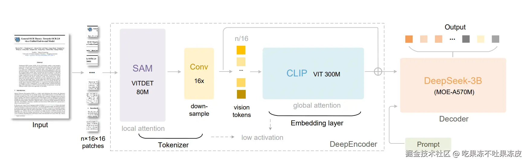 - DeepEncoder:这是一个创新的三级串联架构,能够对高分辨率文档图像进行高效编码和压缩,最终输出极少量(例如256个)的视觉token。
