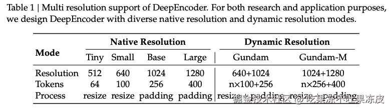 DeepEncoder 主要支持两大输入模式:原生分辨率(native resolution)与动态分辨率(dynamic resolution),各自包含多个子模式。