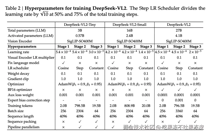 DeepSeek-VL2 训练不同规格模型的详细超参数如下所示: