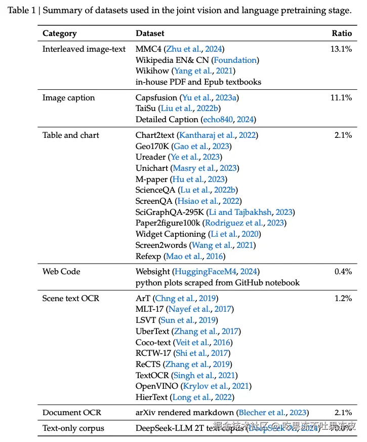 DeepSeek-VL2的训练数据构建分为三个阶段:视觉语言对齐、视觉语言预训练和有监督微调。