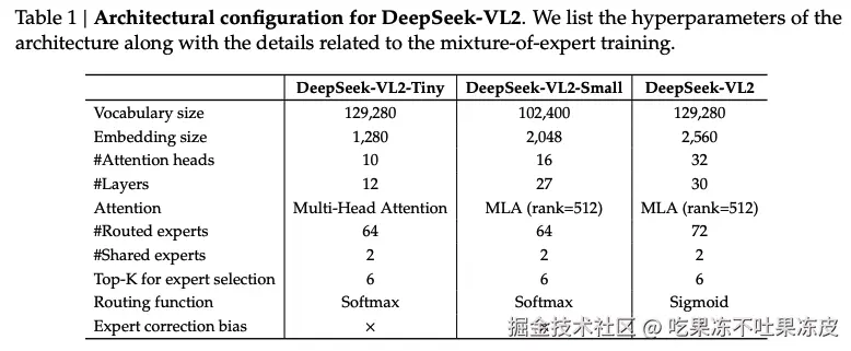 在 MoE 训练时,为每位专家引入全局偏置项,以经济高效地改善专家间的负载均衡。DeepSeek-VL2 有三个模型尺寸:1.0B、2.8B 和 4.5B。