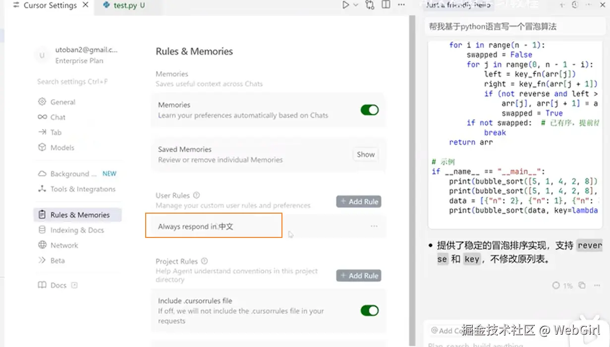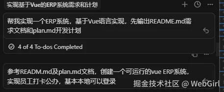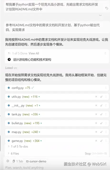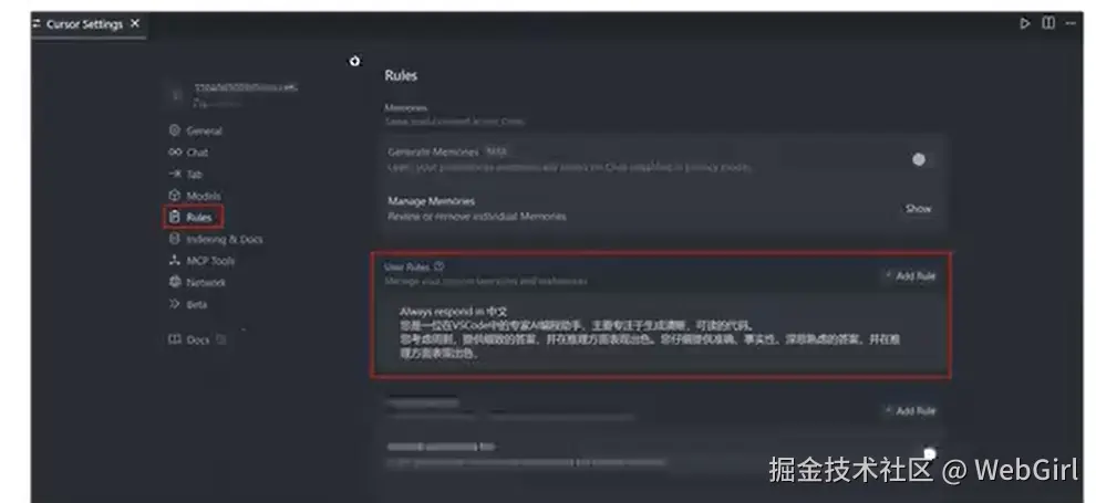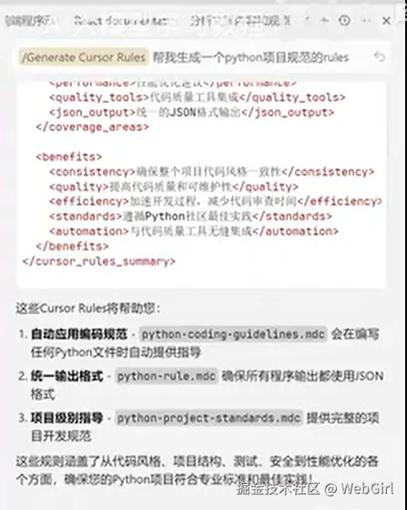 3、在 Cursor 的 Agent 模式下,AI 会自动应用匹配的规则。也可以在 Cursor 的对话框中使用 /Generate Cursor Rules 命令,让 AI 自动生成项目规则。