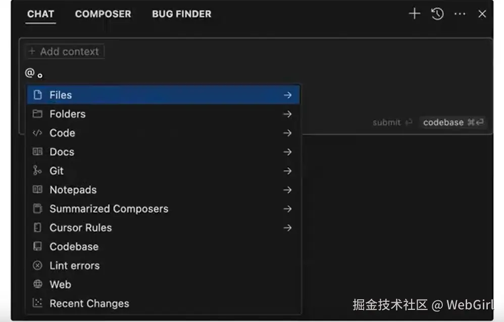 - @Files&@Folders(文件或文件夹) :引用项目中的具体文件或某个文件夹。