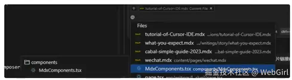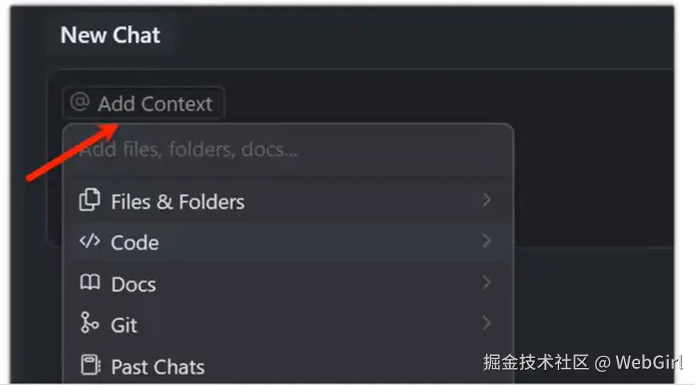 在 Cursor 的 AI 输入框中,通过使用 @,将出现一个带有建议列表的弹出菜单,可以使用向上 / 向下箭头键浏览建议列表,按 Enter 键进行选择,然后在 @后输入内容以进一步筛选选项,通过该方式添加上下文描述到问题中。