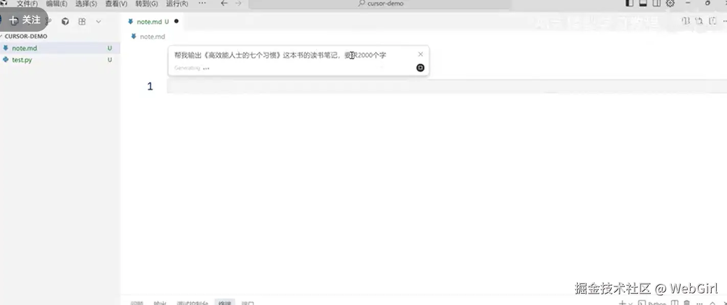 - Ctrl/Cmd + K:打开 AI 提示栏,用于生成新代码或编辑现有代码。