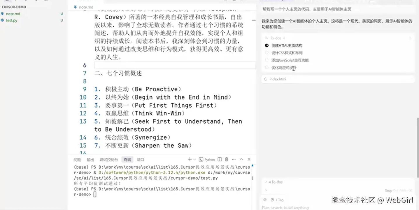 Cursor 功能非常强大,但也取决于你是如何使用它的。使用方式的不同,能发挥出 AI 编程效率多少也会随之不同。接下来分享几个 Cursor 或者说是 AI 编程高效率对话的技巧和建议: