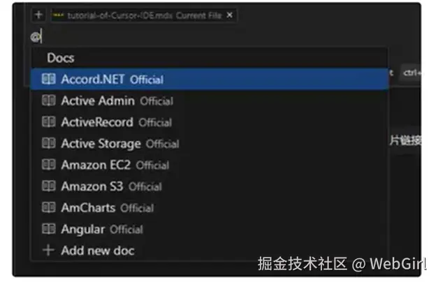 - @Docs(文档) :Cursor 附带一组第三方文档,这些文档已爬取、索引并准备好用作上下文。可以使用 @Docs 符号访问它们