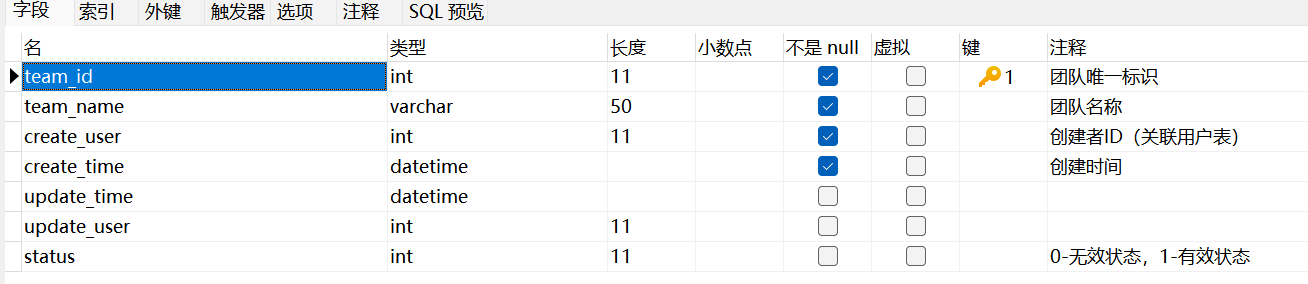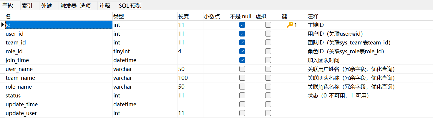 `team_id` INT NOT NULL COMMENT '团队ID(关联sys_team表team_id)',