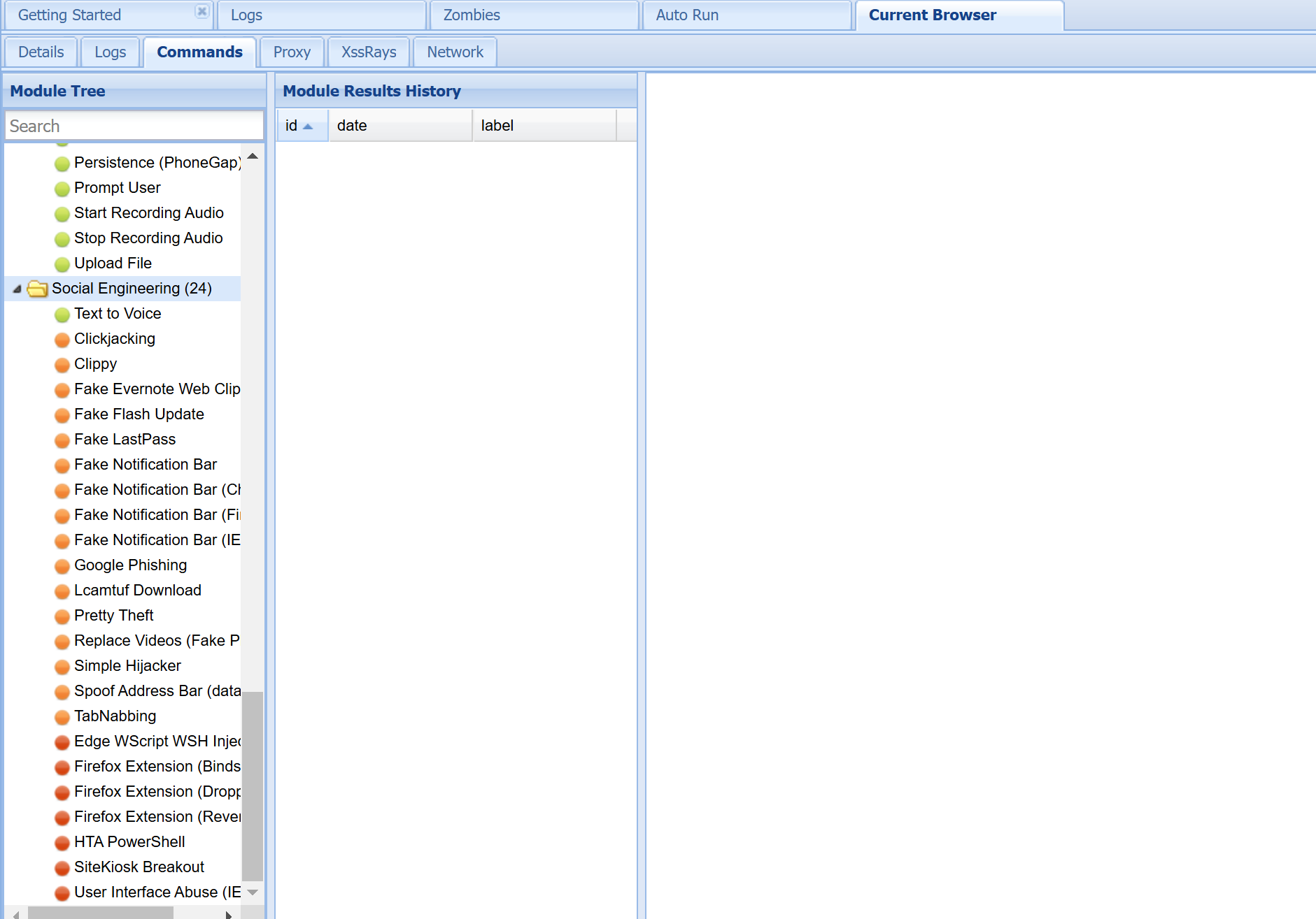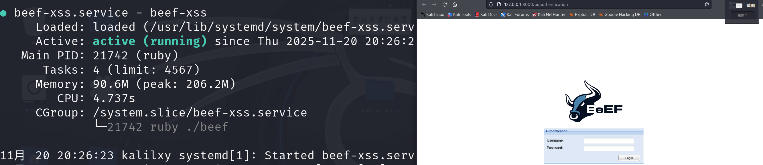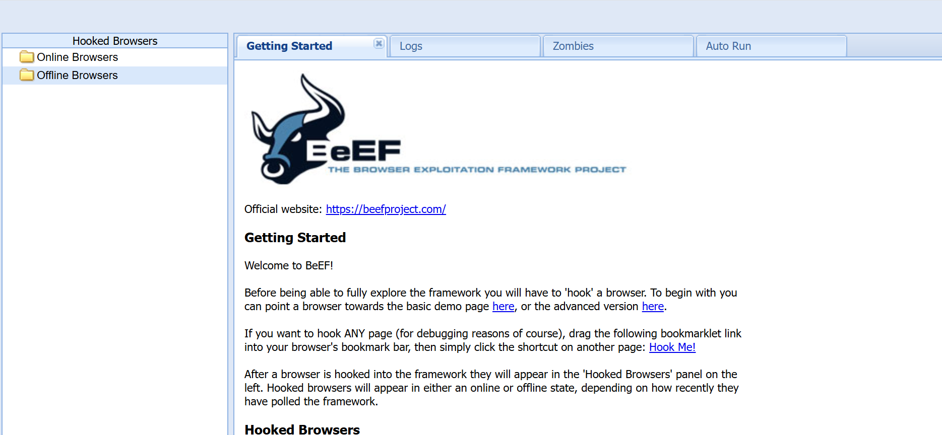 Beef-xss的打开界面中,给我们提供了一个范例,我们在目标网页「提交」这行JS代码,就可以使用工具了。