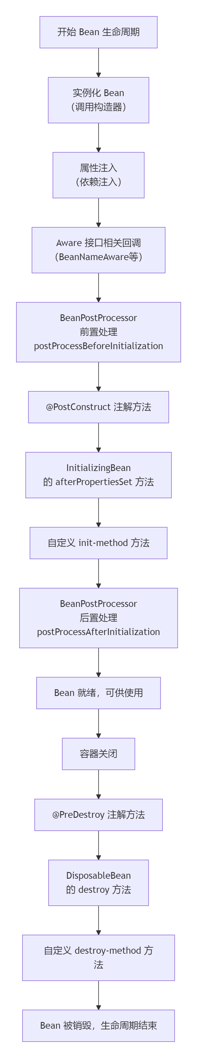 @PostConstruct注解的方法 :这是 JSR-250 规范的一部分,最推荐的方式。 b. 实现InitializingBean接口 :实现该接口的afterPropertiesSet()方法。 c. 自定义init-method:在 XML 配置中指定init-method属性,或使用@Bean(initMethod = "...")注解。 对应上图 :第六、七、八步(@PostConstruct->afterPropertiesSet->init-method)。 - BeanPostProcessor 后置处理 描述 :与第 4 步对应,这里是