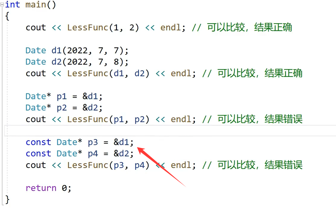 能不能匹配上特化上面那个可以匹配上,下一个匹配不上,匹配到原模版去了,特化的DAte*,和const DAte* 是两个类型,constDAte* 不能给DAte*,因为权限呗放大了,
