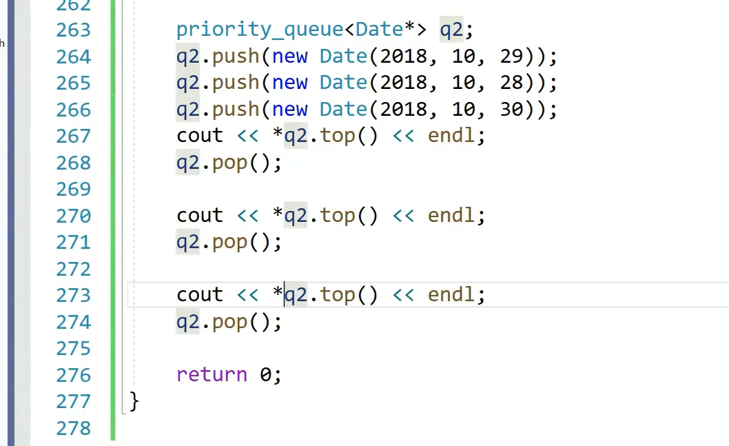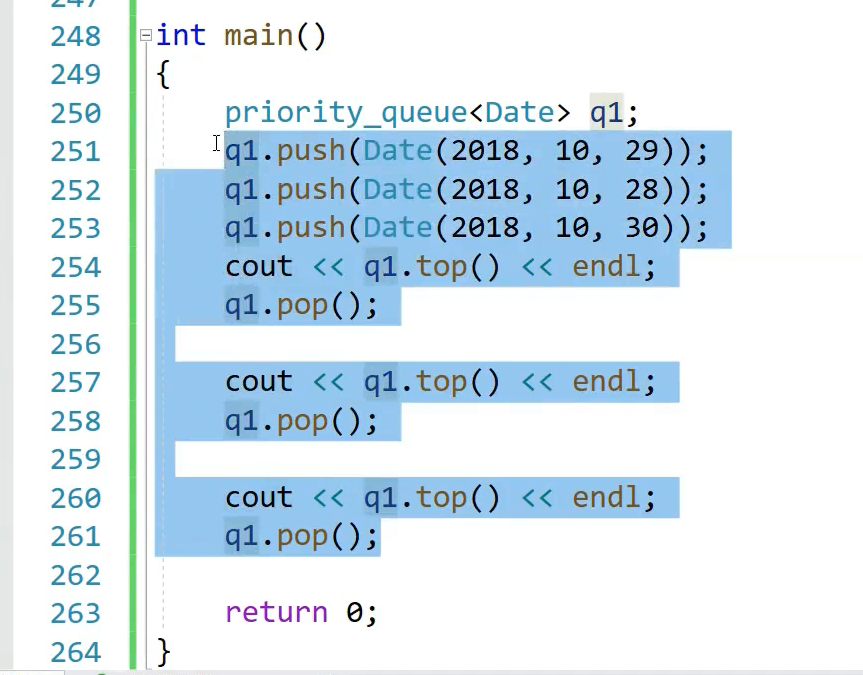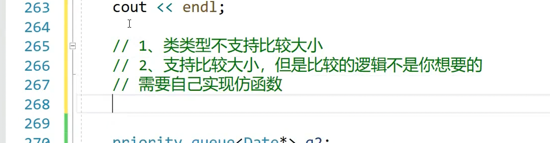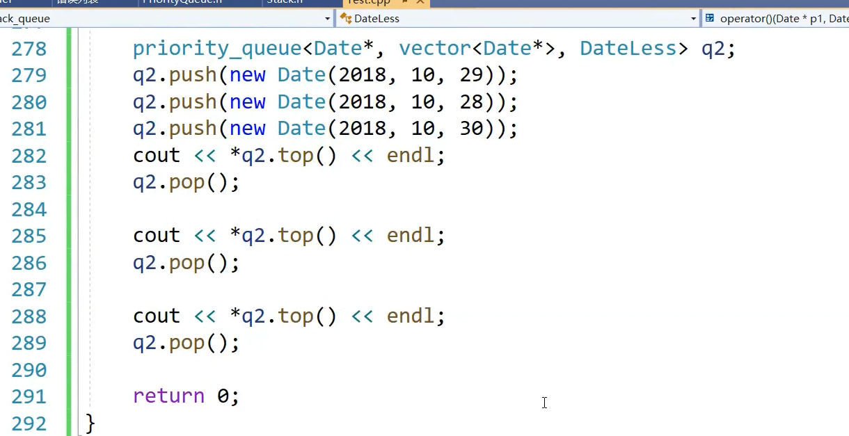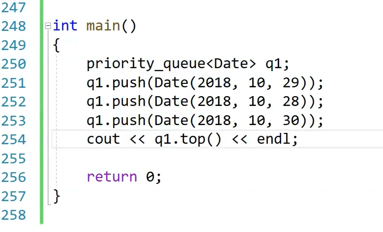 我们直接用日期类对象做这个,插入日期类支持,因为priority queue默认仿函数是less,less内调用的是比较大于和小于,日期类对象支持大于和小于,也就是说,类类型也没关系,自己支持一下就OK。